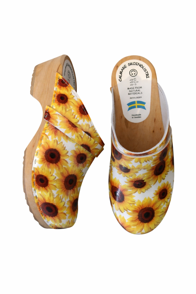 Klassisk trätoffel med naturbotten i trä av al, överdel i äkta skinn med blomtryck föreställande solrosor.