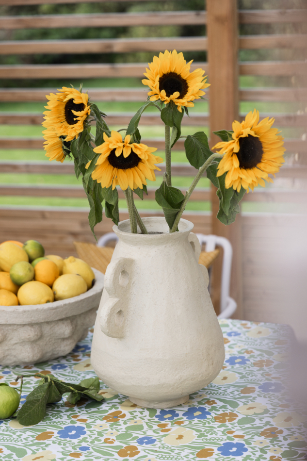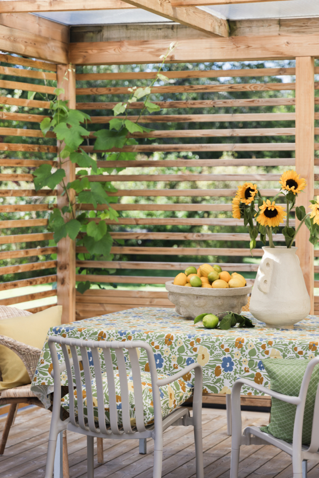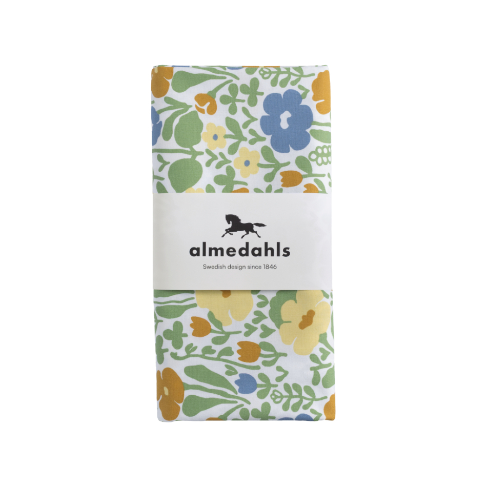 Det klassiska mönstret med stiliserade blommor i grönt och gult ger bordet en glad och somrig karaktär. Mönstret skapades av Anna-Lena Emdén under 1970-talet och hette ursprungligen Ängland.