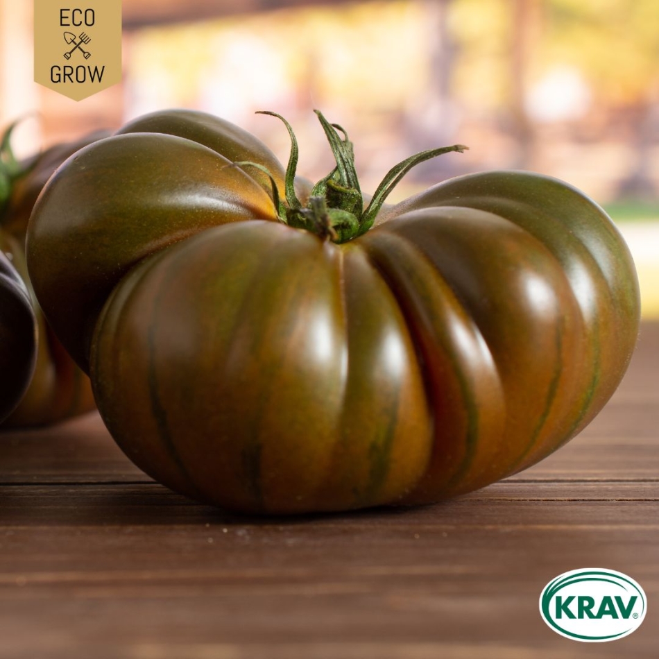 Är en tidig bifftomat med spektakulära, plattrunda frukter i svartgrönt som mognar till rödbrunt med mörk ovansida. Frukterna väger vanligtvis 200–300 gram, men kan i goda förhållanden bli upp till 400 gram. De har tunt, lent skal och en sötkryddig smak med låg syra – en av de mest uppskattade i sin klass. Färgen kan vara missvisande, så känn efter när frukten börjar mjukna för att avgöra mognad. Skotten i bladvecken, ""tjuvarna"", tas bort.
