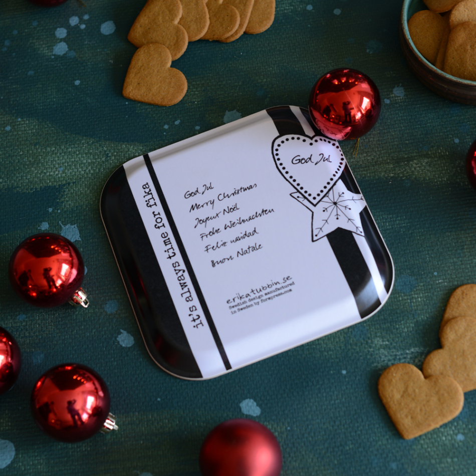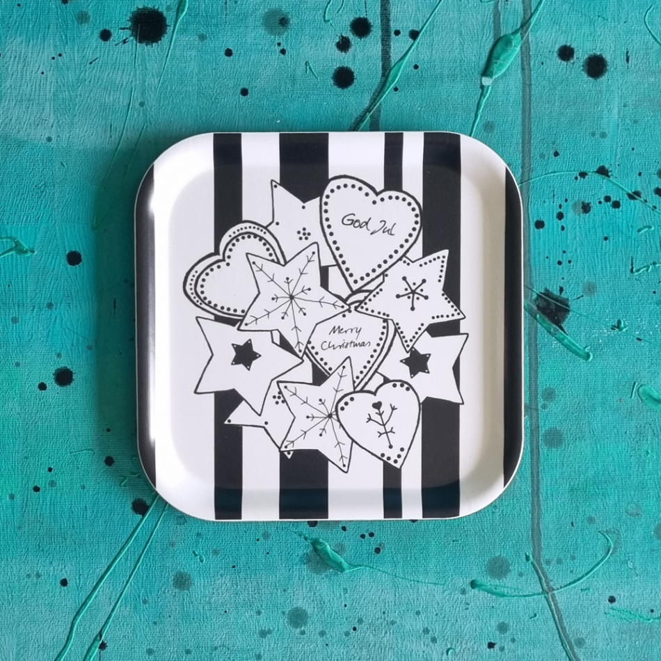 Kvadratiskt litet kakfat/bricka med pepparkaksmönster. På baksidan står det God Jul på sex olika språk.
