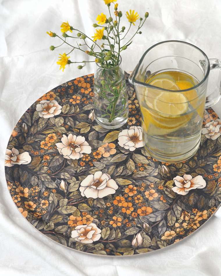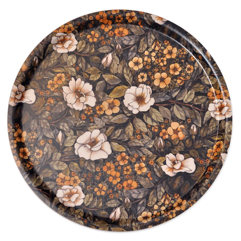 Rund bricka 38 cm, i formpressat björkträ och handritat mönster inspirerat av vita Pimpernellrosor och Ölandstok. Mått: diam 38 cm, svensk produktion.