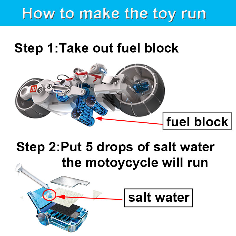 Experimentlåda för barn. En bränslecellsmotorcykel som drivs av saltvatten. Bilen lär barnen om nya former av ren energi, samtidigt som man bygger och tankar sin egen leksak: i med saltvatten och kör!