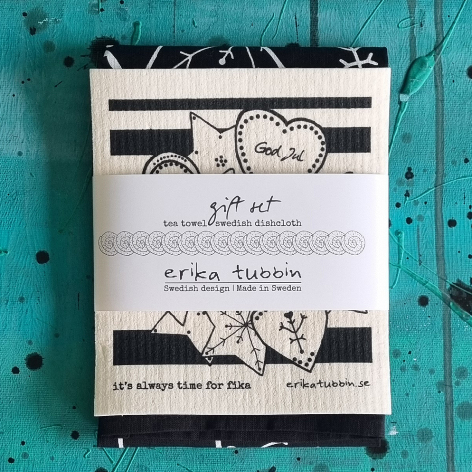 gåvoset SWEDISH FIKA GINGERBREAD kökshandduk + disktrasa svart-vit