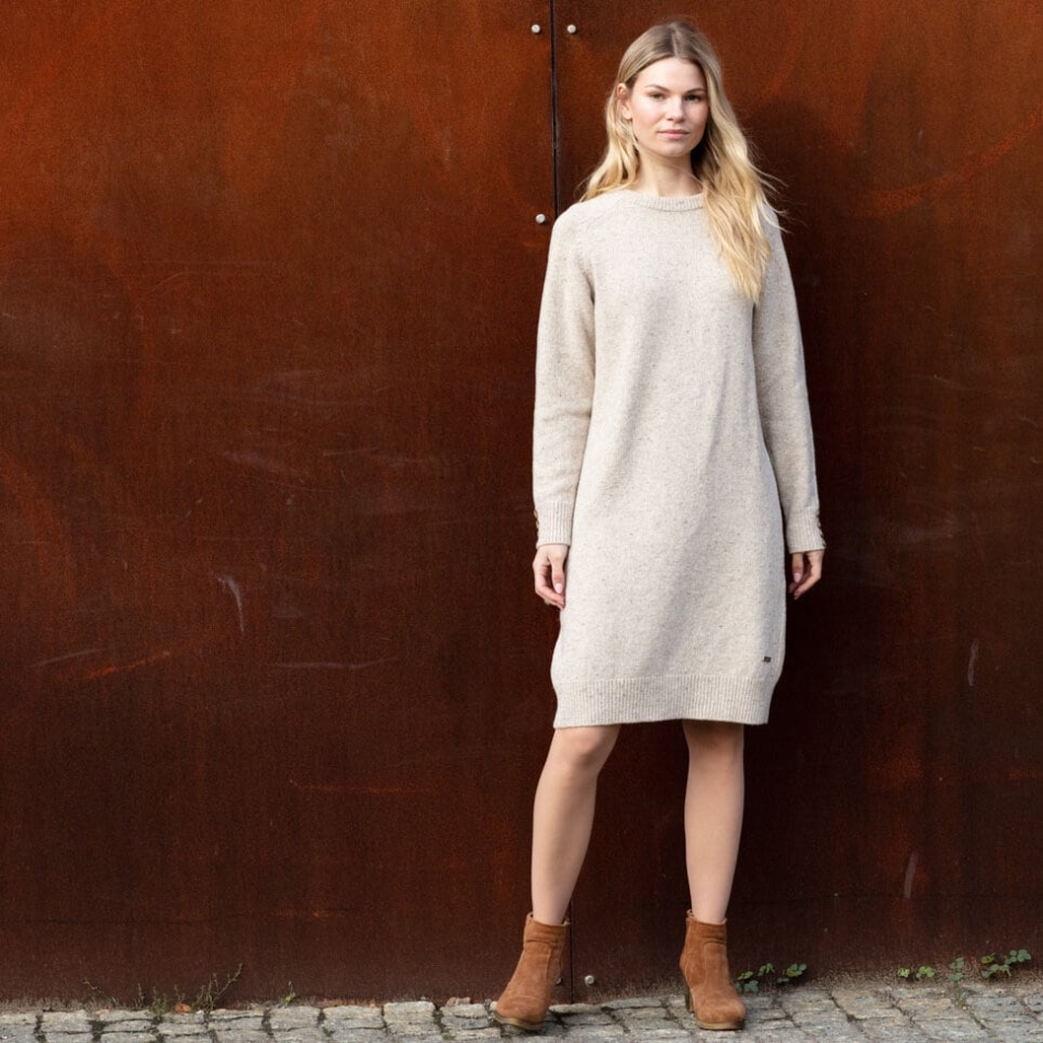 Högalid dress är en stickad klänning i värmande nyull/polyamid mix. Klänningen med sitt mjuka garn får ett tweed utseende med inslag av olika färger i garnet.