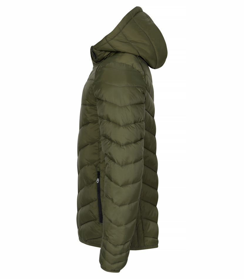 En varm och lätt jacka med dunliknande vaddering. Tillverkad av 100% återvunnen polyamid. Avtagbar barnsäker huva, tre ytterfickor med dragkedjor och två innerfickor. Elastiskt avslut i nederkant samt ärmar. Utrustad med färgade zippullers, hörlurslösning och dragkedja.