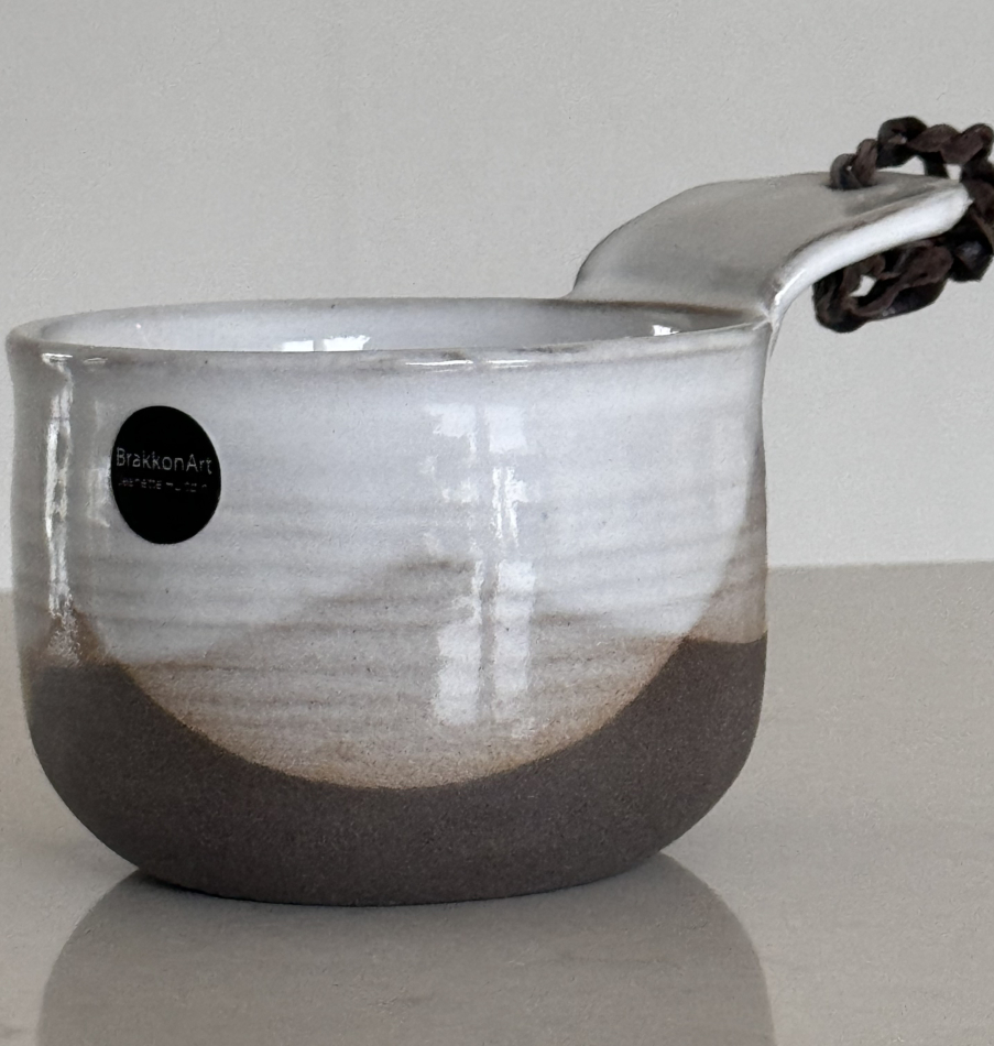 Handgjord kosa i stengods med tvinnad läderrem. Motiv fjälltoppar. Rymmer ca 2,5 dl.Artnr: 100