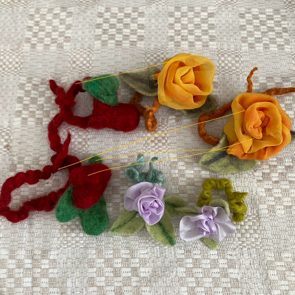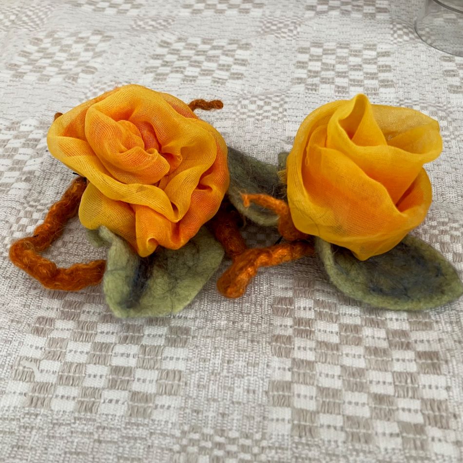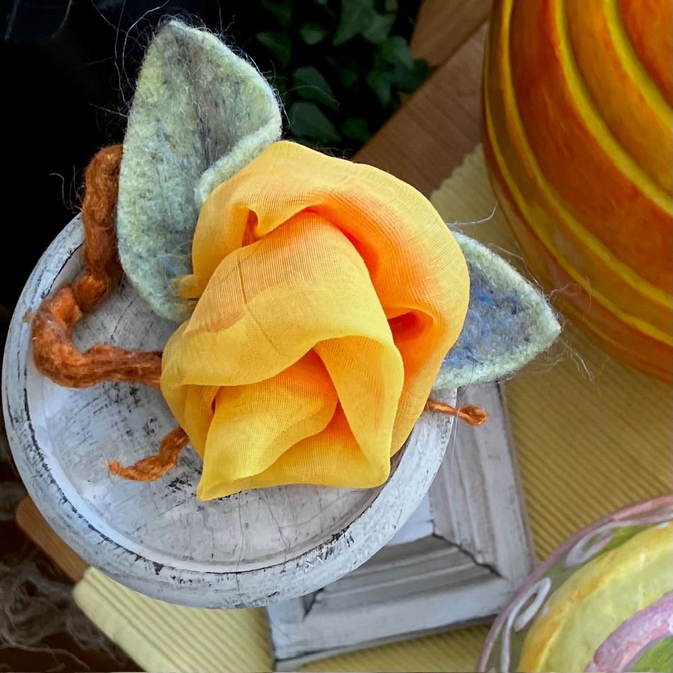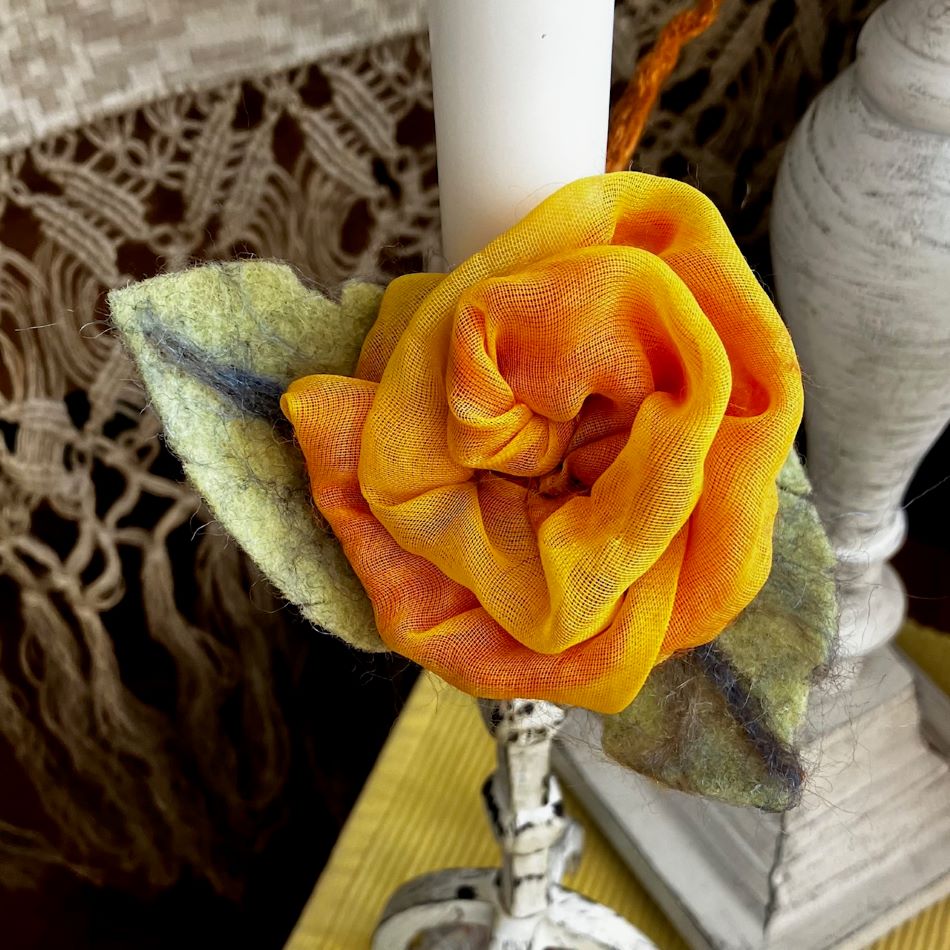 En vacker men enkel ljusmanschett i gul chiffong blandad med ull. En våttovad ring av finaste merion ull , en aning glitter i ull och med isydd gummitråd. Ullblad som dekoration. Vacker att ha i ljusstakar men fungerar jätte bra som servettring eller dekoration där du finner plats för den. Även perfekt att sätta ihop sjalar eller halsdukar när det blåser.