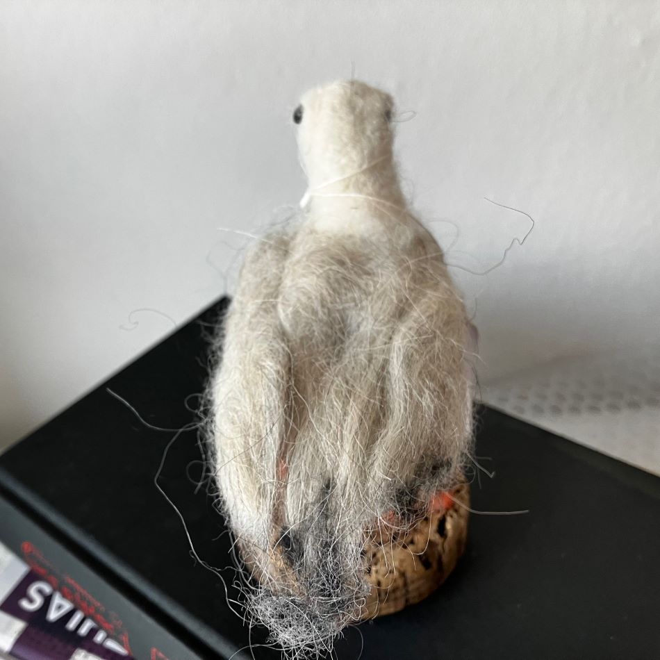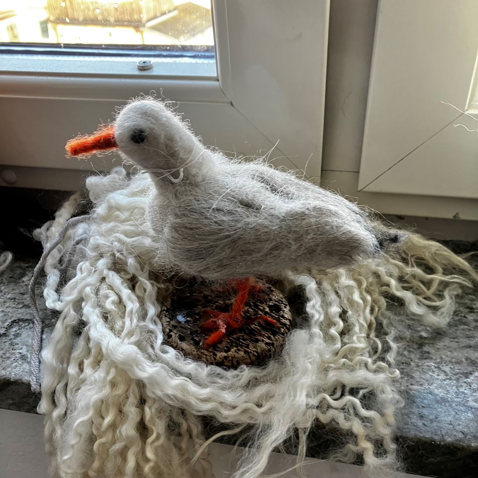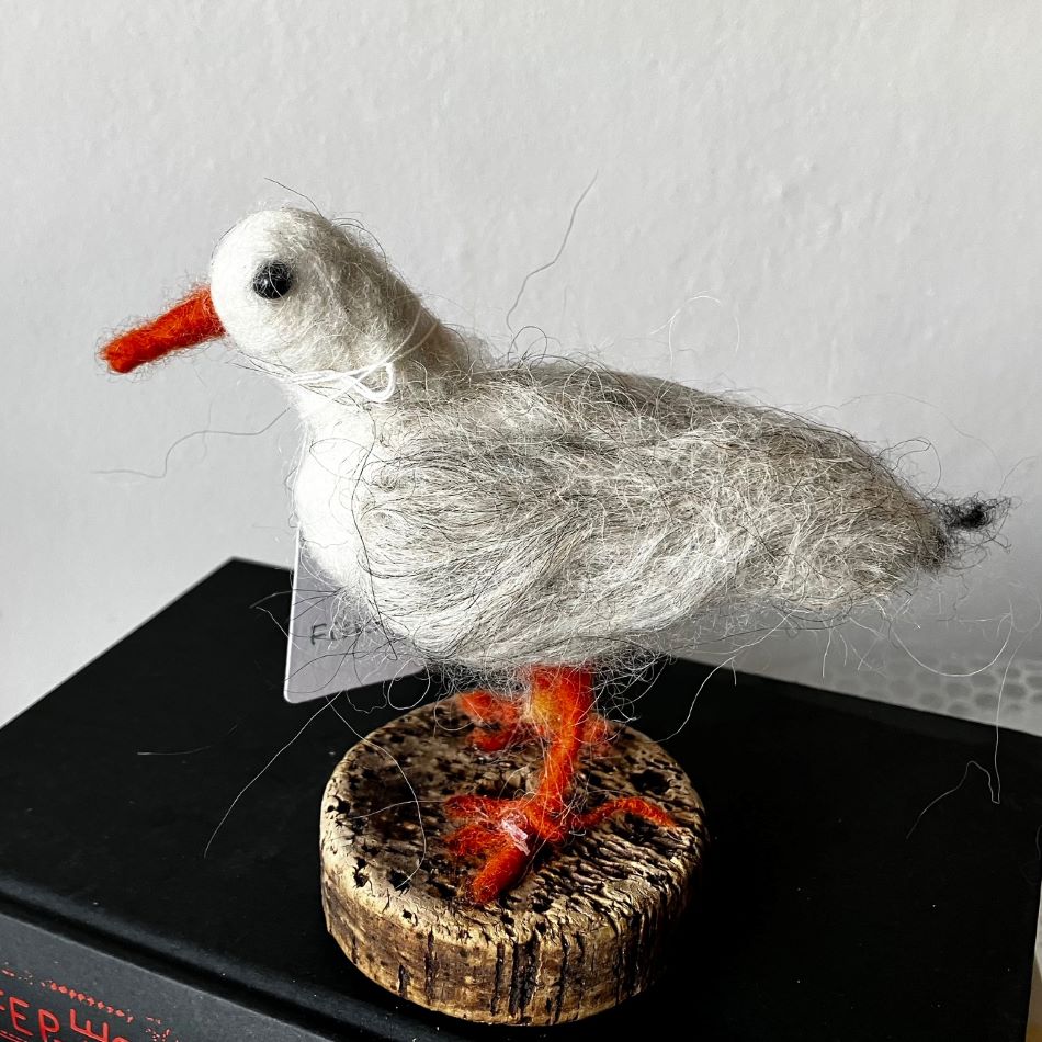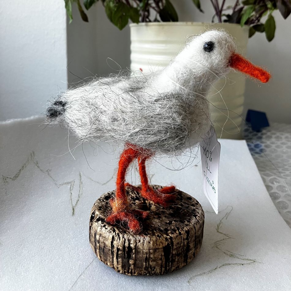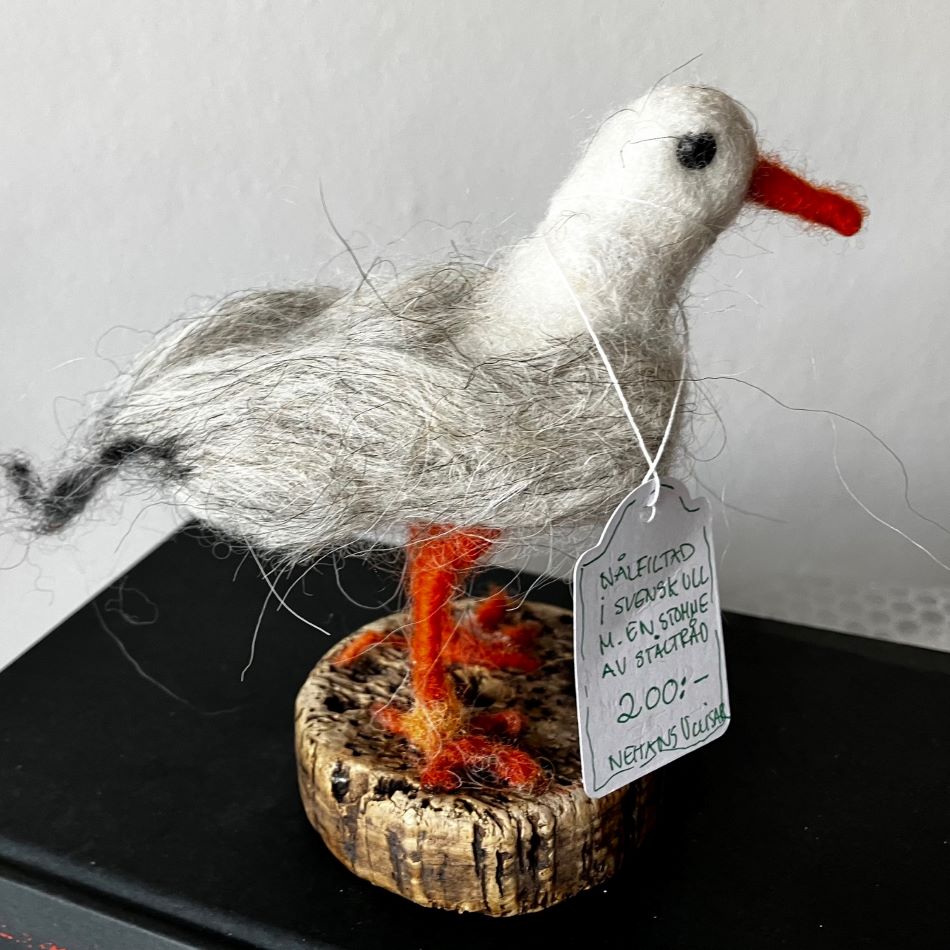 En nålfiltad mås av 100 % ull, stående på en platta av kork. Små ögon av glas. Unik design av Nettans Ullisar