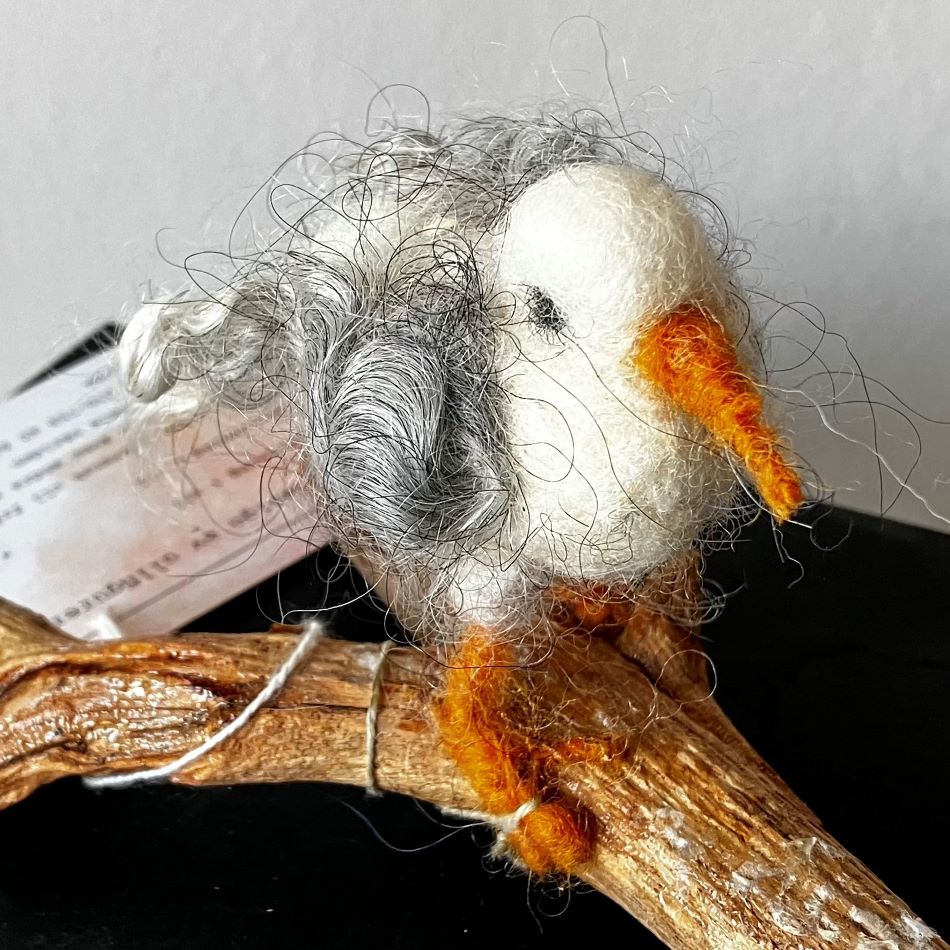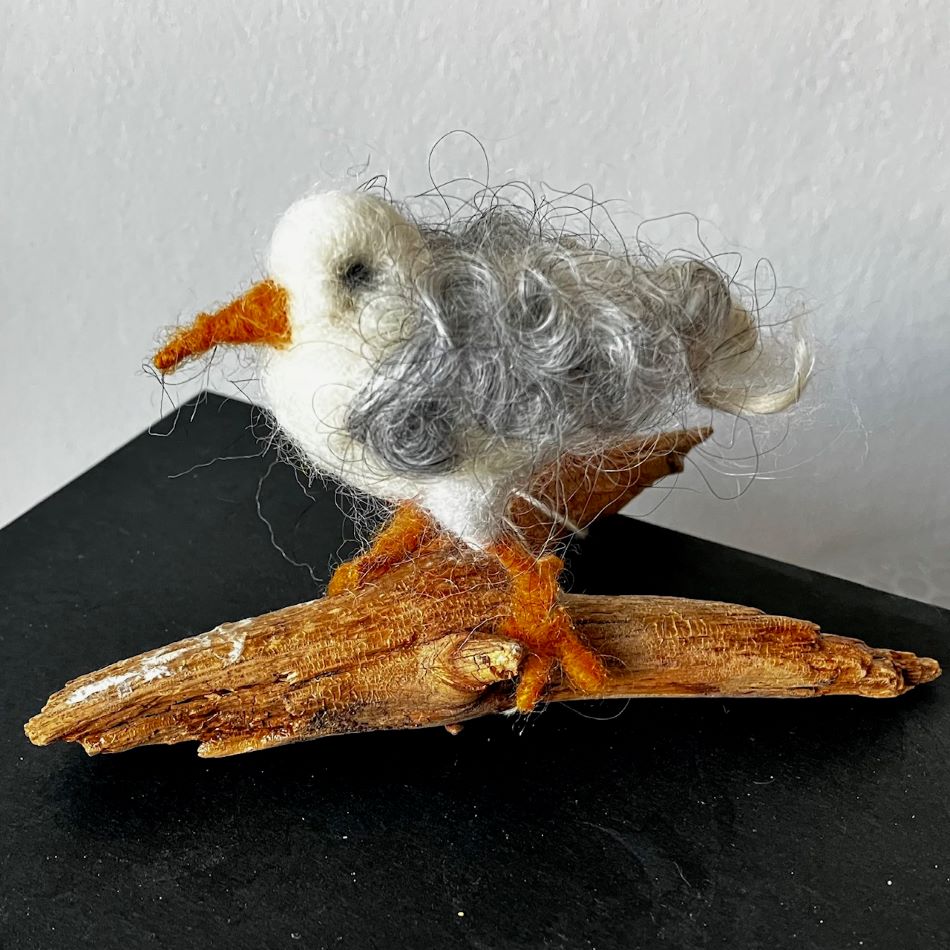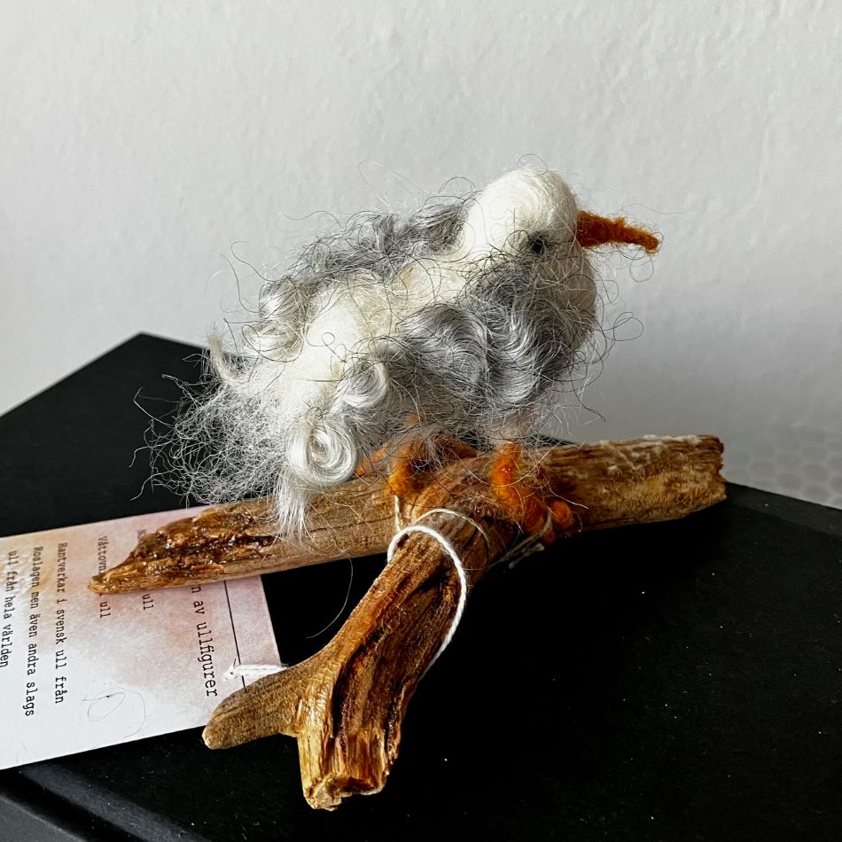 Liten rolig mås skapad av svensk ull. Stående på en pinne, Nålfiltad och lite ståltråd i ben. Måsen har lockar som vingar från gotlandsfår.
