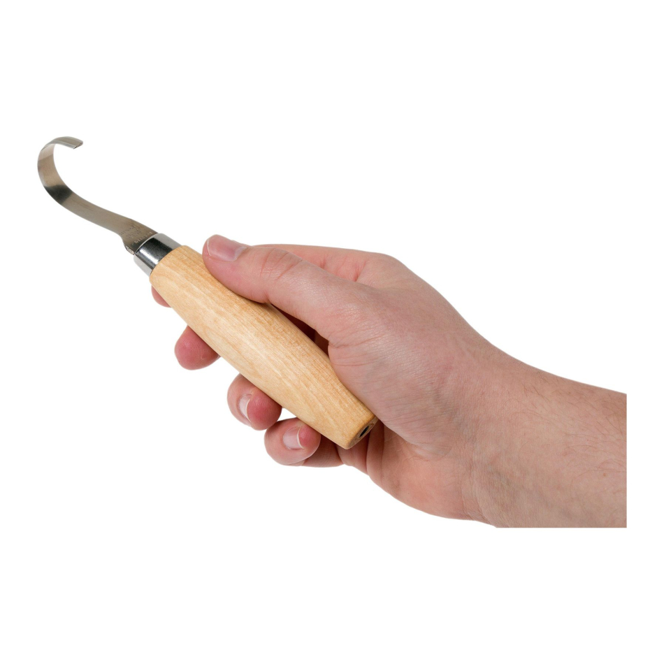 Den här kniven har ett enkel-eggat blad för högerfattning. Bladets bakkant är inte vass vilket ger dig möjligheten att använda vänsterhandens fingrar för att skjuta på bladet från baksidan. Bladet har den snävare kurvaturen av våra skedknivar. Vi har optimerat bladet så att det löper lätt över skedens eller skålens insida. Tillsammans med optimerade eggvinklar på bladet ger detta dig den bästa täljupplevelsen. För att skydda både dig och kniven levereras den med ett enkelt men genialt designat eggskydd tillverkat lokalt av vegetabiliskt garvat läder av kohudar från regionen.