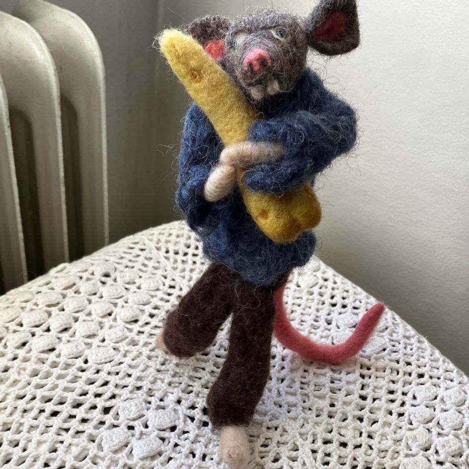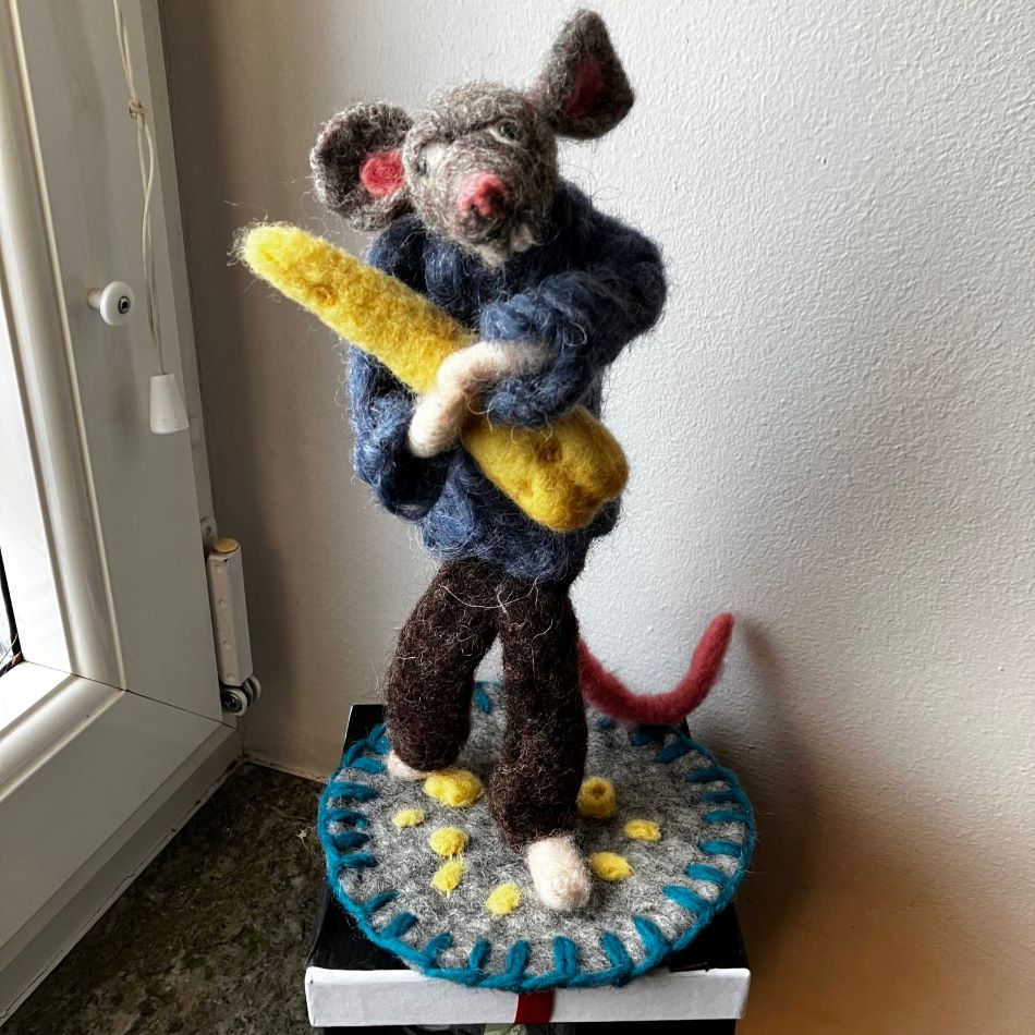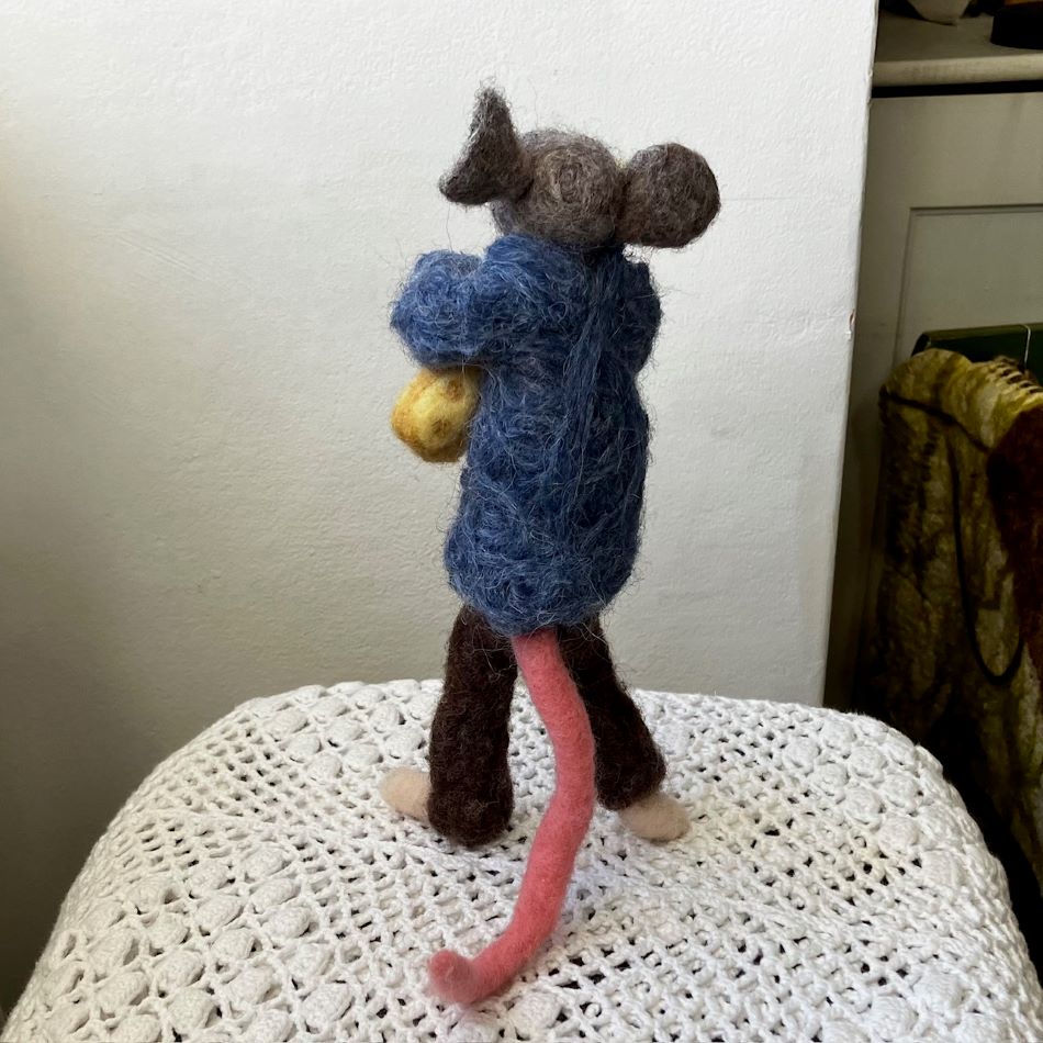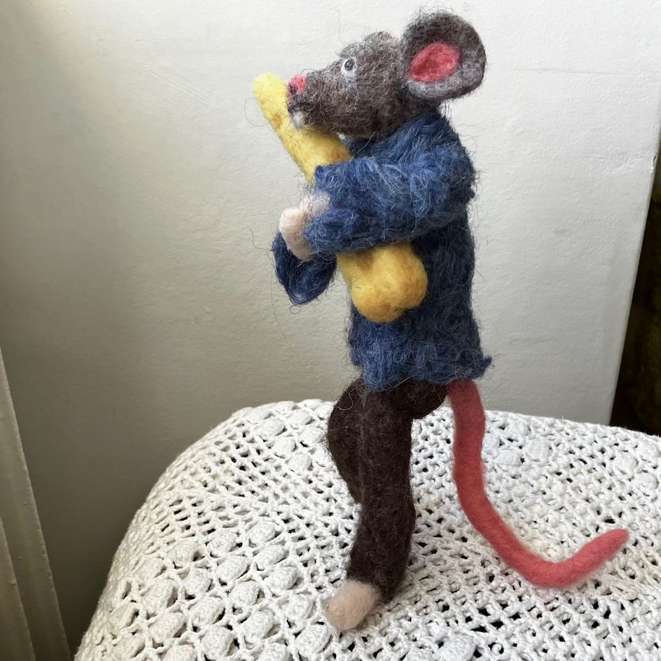 Ost tjuven, musen är nålfiltad och kroppen har en stålvajer i sig vilket gör att du kan välja att låta den stå eller sitta. Design Nettans Ullisar