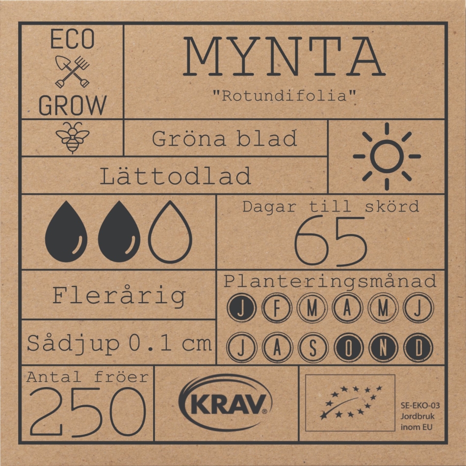 Förkultivering: Så fröna 0.1 cm djupt (ljusgroende fröer) och håll sådden fuktig. Plantera ut i krukor när jorden blivit varm och frostrisken är över. Myntan har en tendens att föröka sig okontrollerbart så krukodling är att föredra. Utvecklas bäst i ett varmt och skyddat läge. Toppas för ett buskigare växtsätt. Kan även sås inomhus året om.