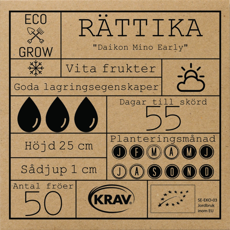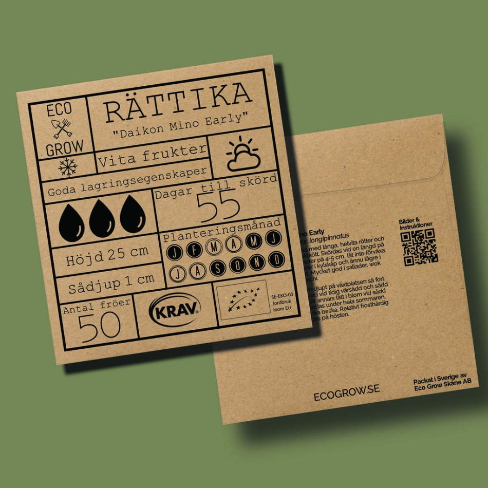 Är en fantastisk daikon-rättika med långa, helvita rötter och ett krispigt och milt fruktkött. Skördas vid en längd på ca 30 cm och en diameter på 4-5 cm, låt inte förväxa. Kan lagras flera månader i kylskåp och ännu lägre i fuktig sand i jordkällare. Mycket god i sallader, wok eller varför inte i en kimchi.