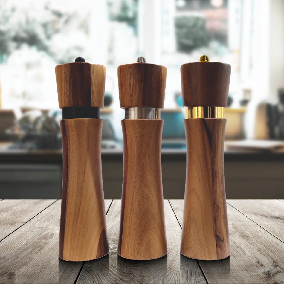 Tillverkade av massivt akaciaträ med keramisk rotor och detaljer av rostfritt stål, ingen plast.