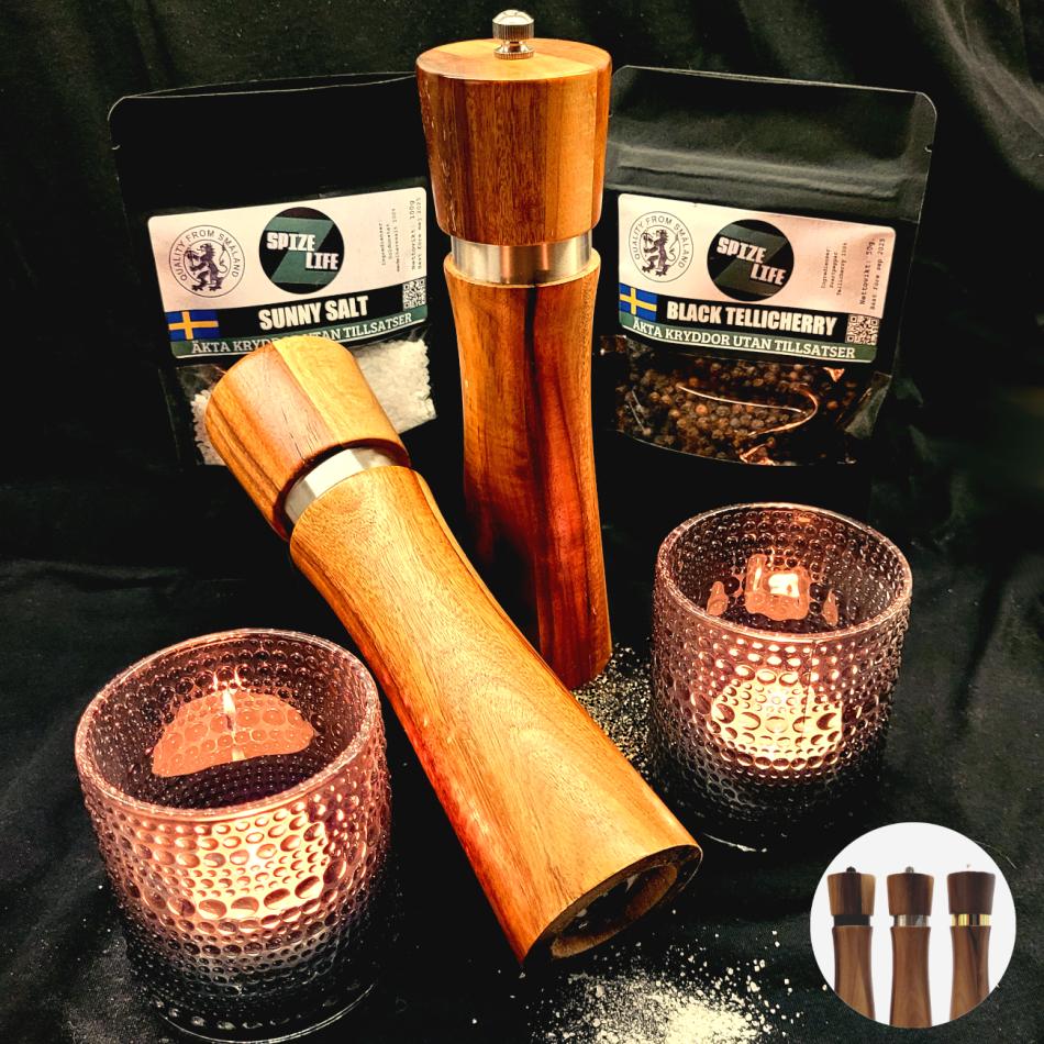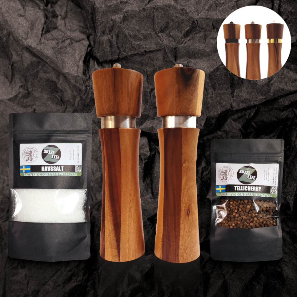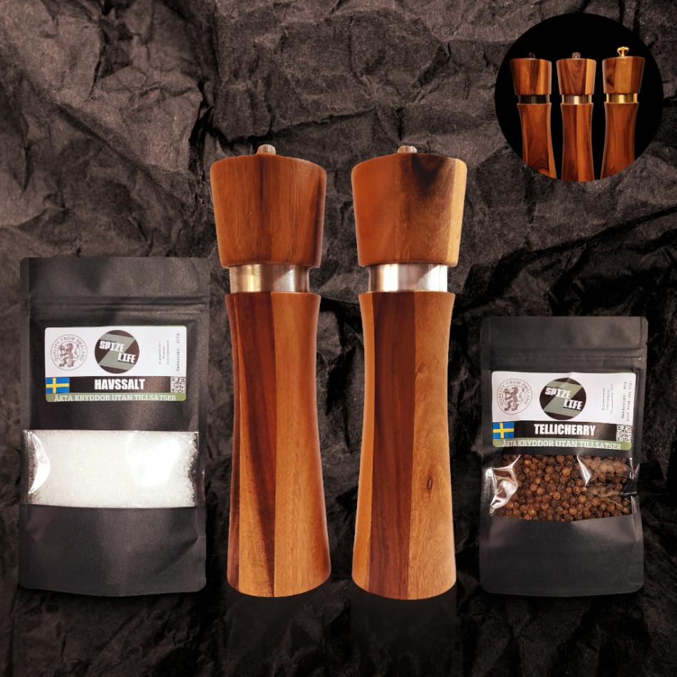 Inklusive havssalt 250g samt Tellicherry-peppar 80g.
