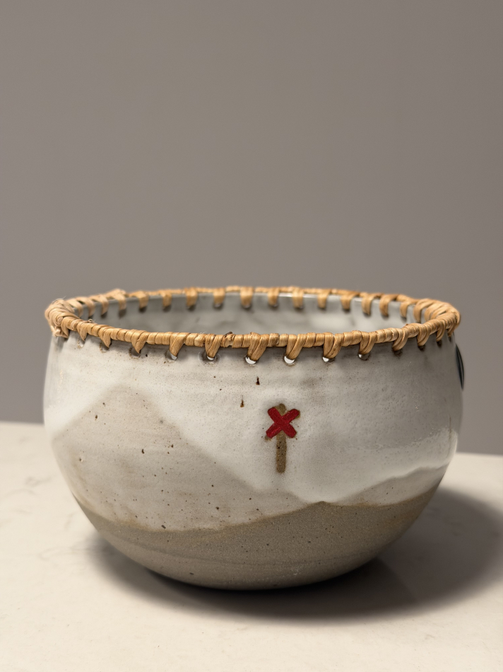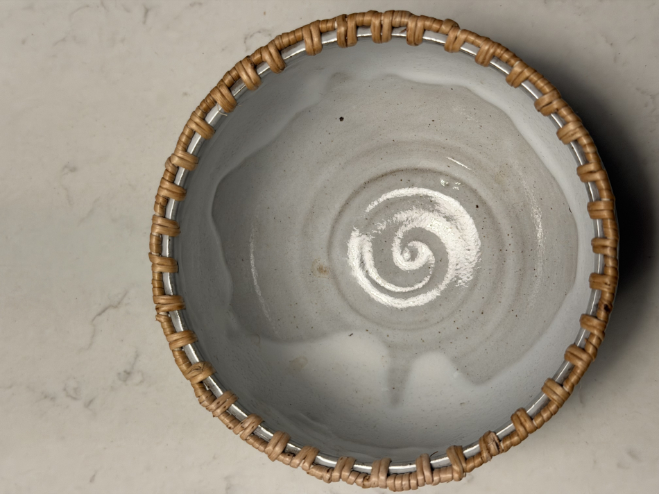 Skål i stengods med kant av björkrot. Dekor ledkryss.