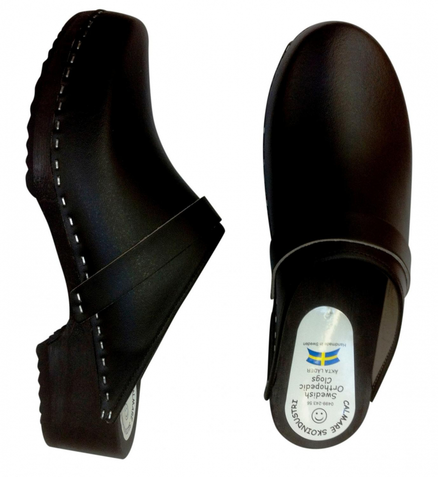 Klassiska trätofflor med svartbetsad botten i trä av al från Calmare Skoindustri.