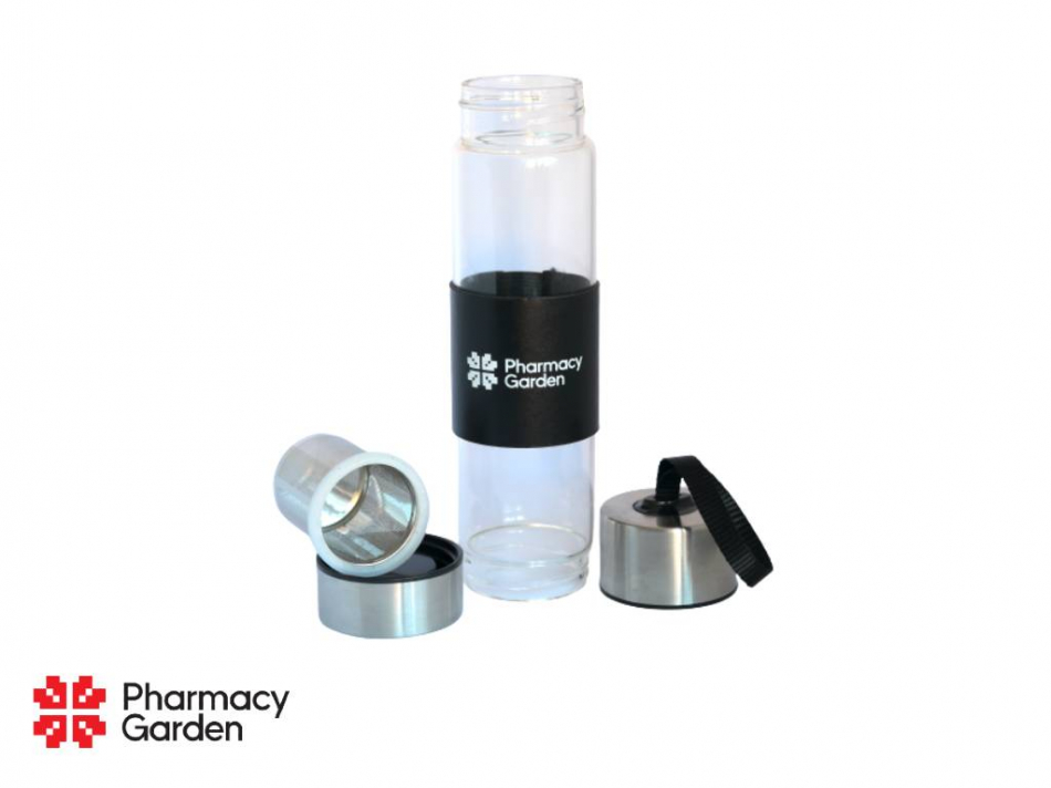 Glasflaskan är gjord av värmetåligt termiskt glas med ett rostfritt finmaskigt filter. Det finmaskiga filtret säkerställer att örtrester inte hamnar i vattnet.