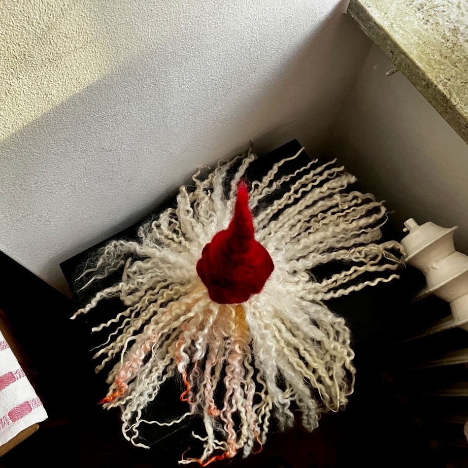 Handgjord tomte med röd luva. Nålfiltad kropp och luva i svensk ull, långa lockar av teeswaterfår. Varje tomte blir ej exakt lika varandra utan du får ett unikt exemplar. Hustomten väger cirka 80 gram och är kropp till luva är 27 cm. Lockarna är cirka 20 cm långa. Tips är att ställa tomten på en ljusstake eller vas för att få till lockarnas vackra fall. Design Nettans UllisarArtnr: 2025tomtelngalocka