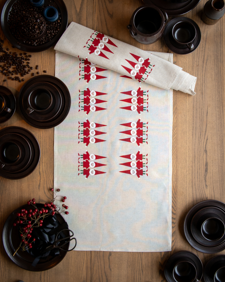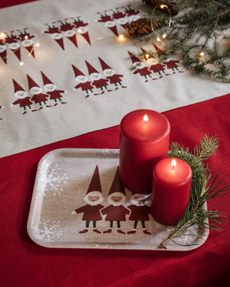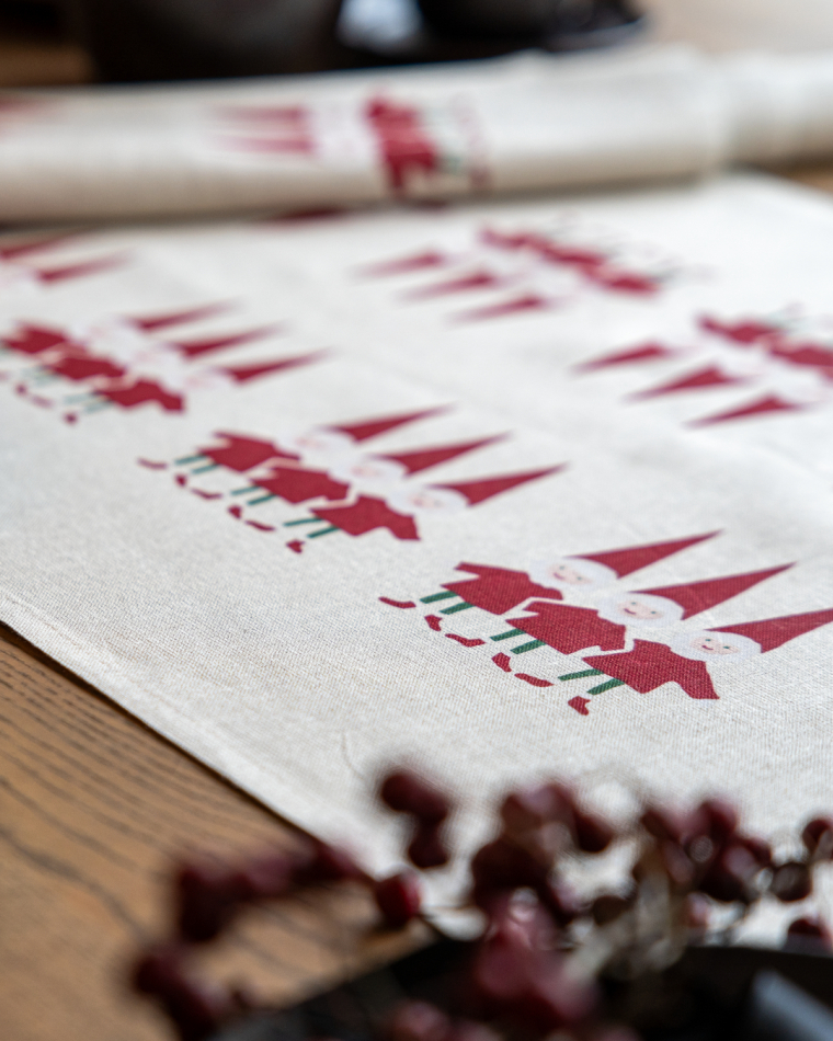 Söta löparen med mönstret Tomtenisse skapar julkänsla. Duken är i halvlinne och går fint att både stryka och mangla.