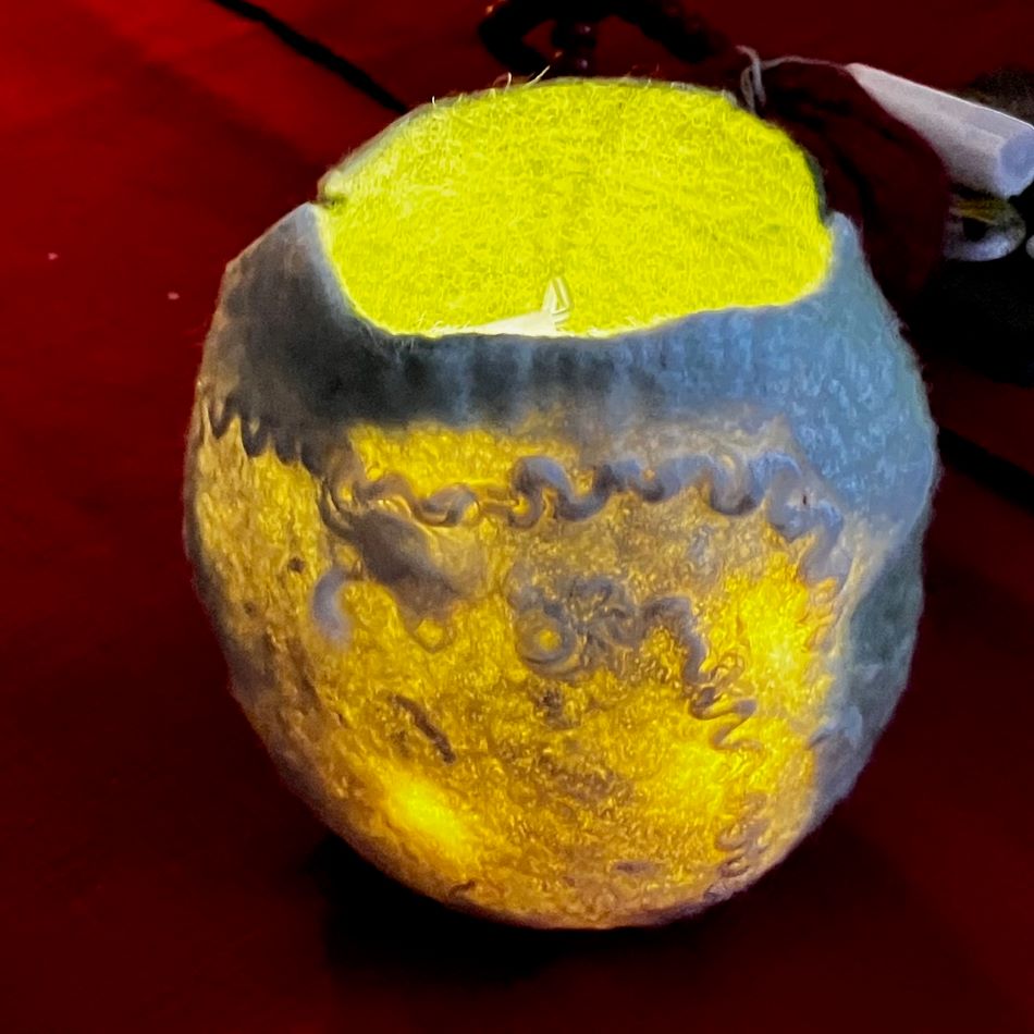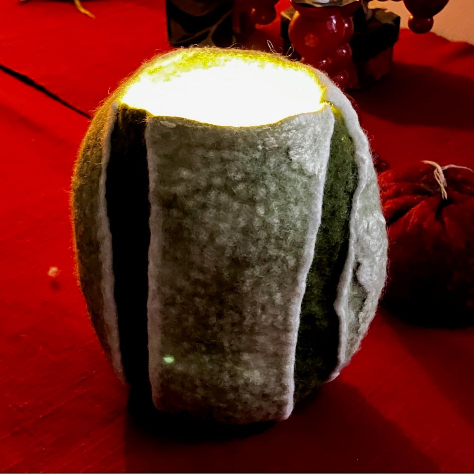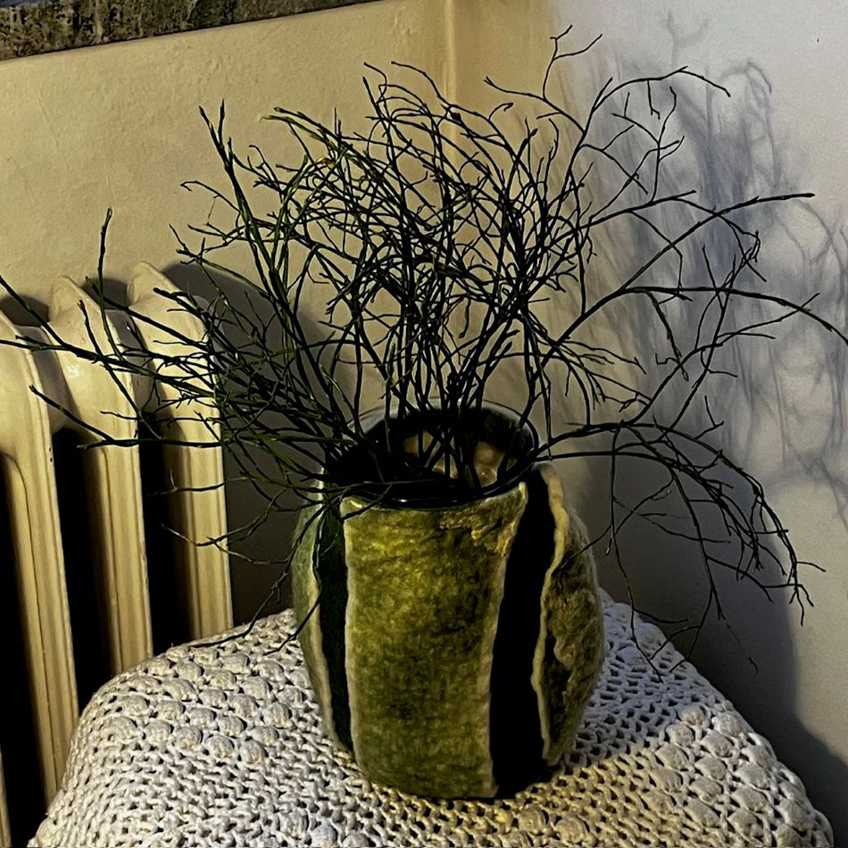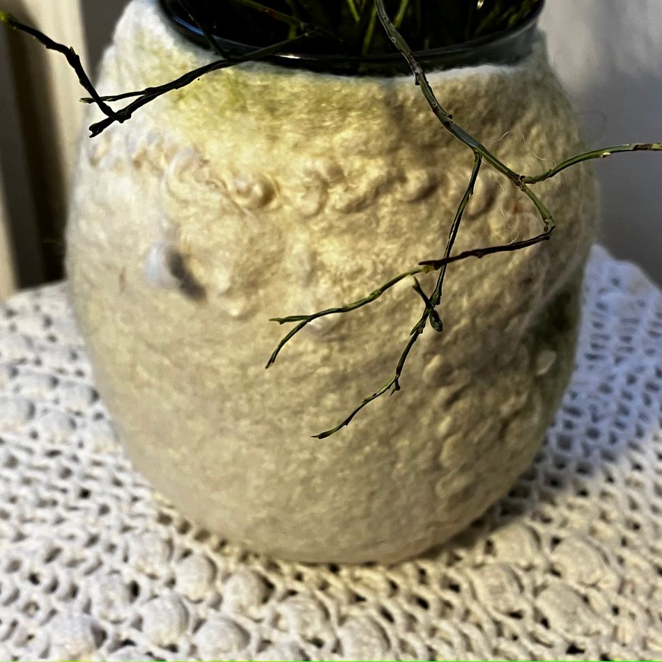 En ovalformad vas i finaste svensk ull. Grön och vit. Du kan använda olika sidor på vasen beroende på om du vill ha färg eller endast en vit sida. Den vita sidan är även genomskinlig så du kan få en vacker ljuslykta.