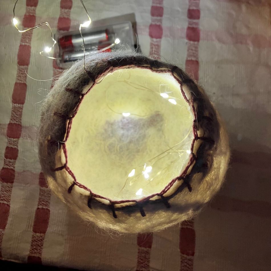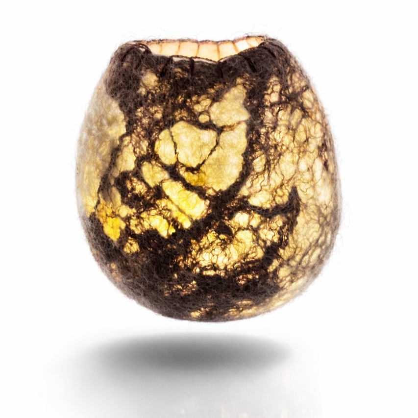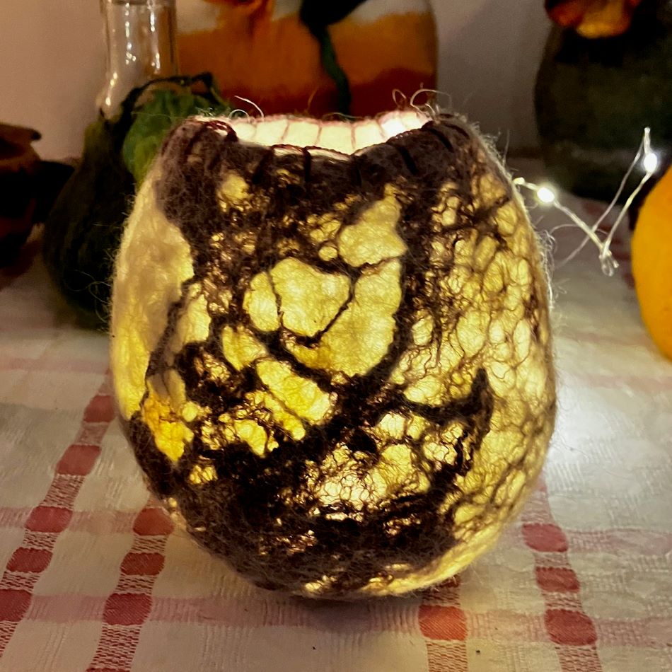 En vacker vas som även är en ljuslykta i finaste ryaull och rosa silke. Ljuset skimrar igenom den tunna ullen och du kan använda den även som vas.